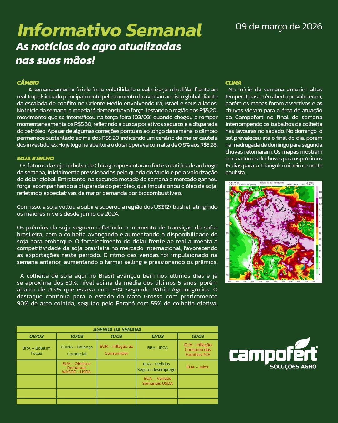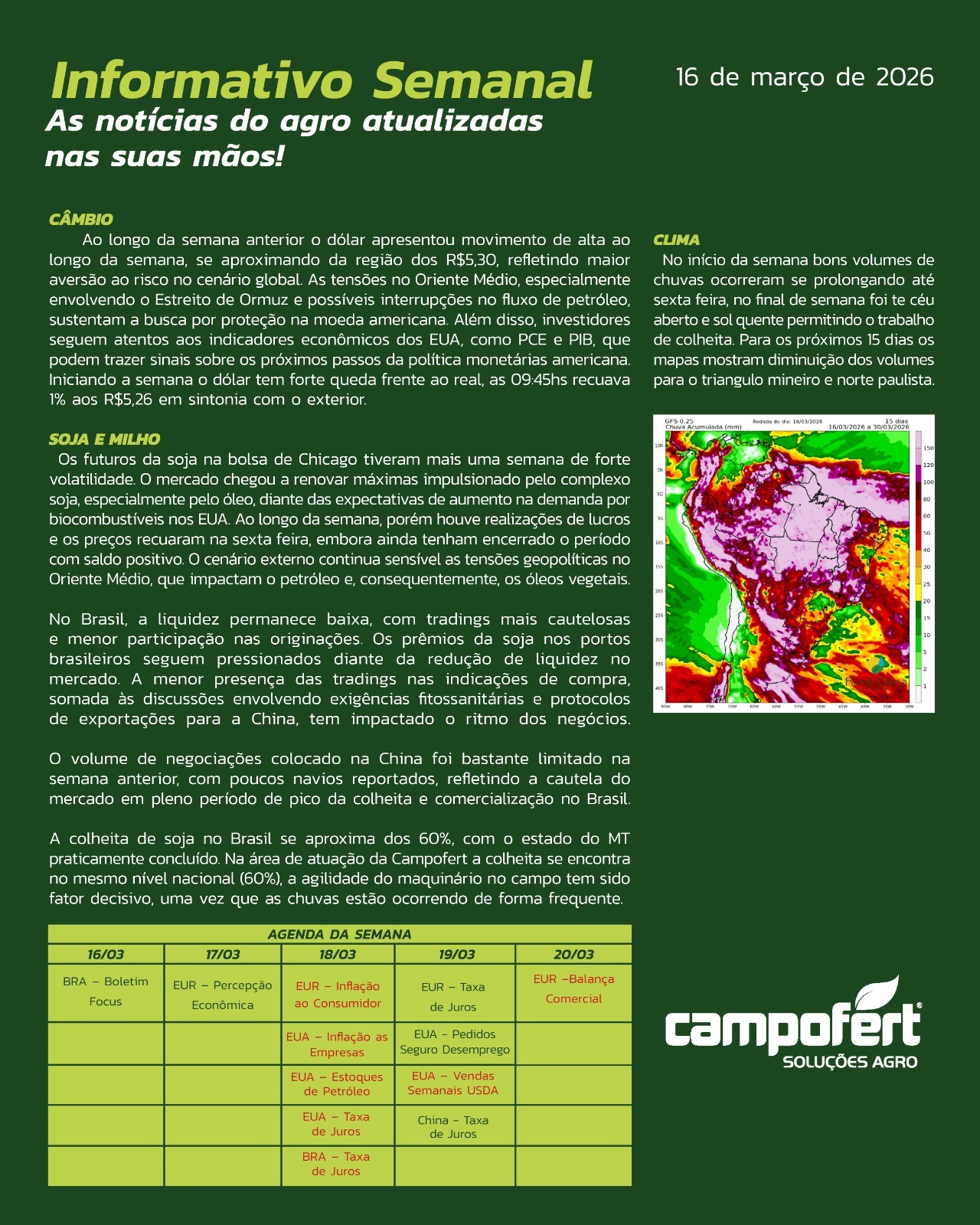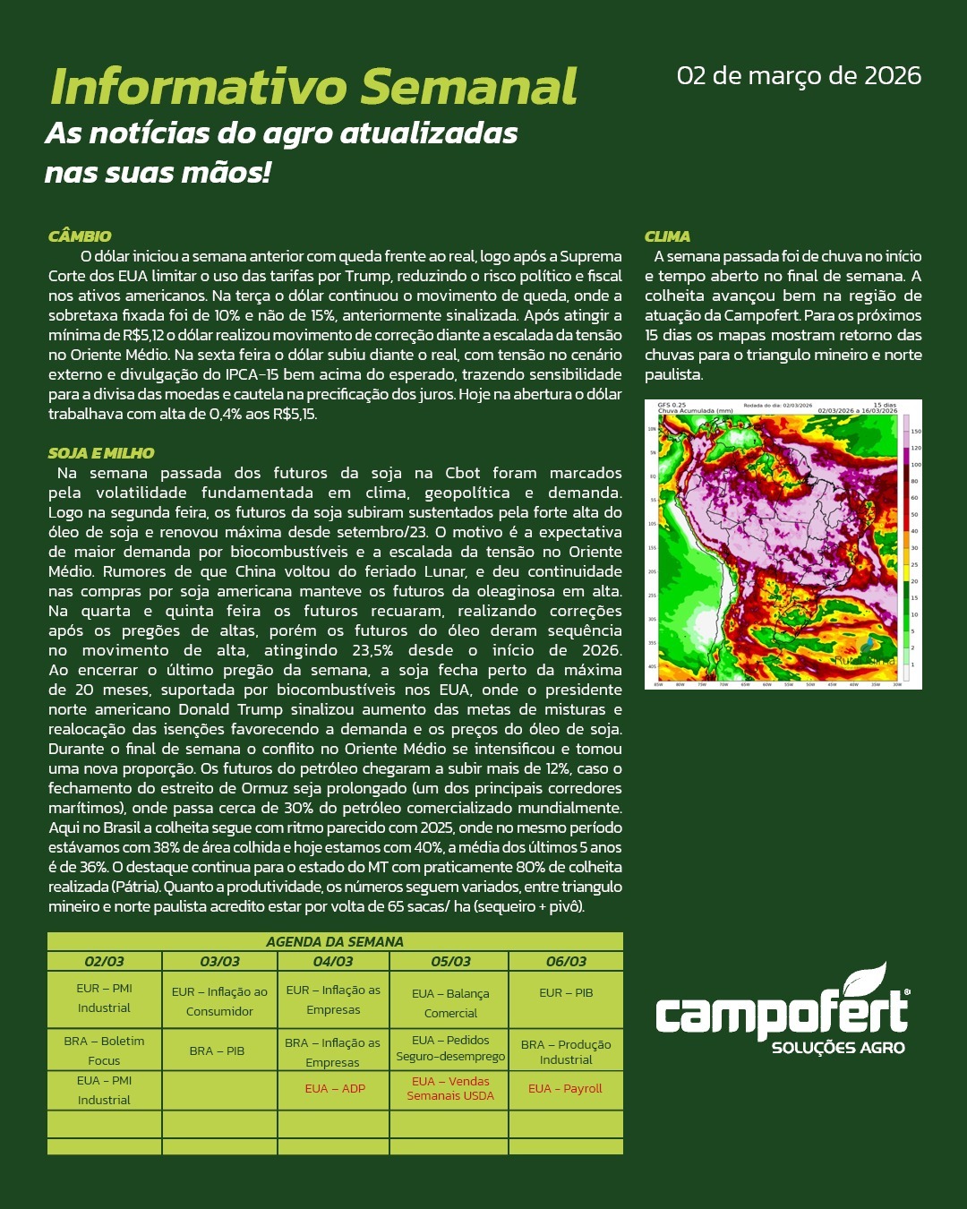 Informativo Informativo da Semana 16 de Março de 2026 Informativos Anteriores 09 de Março de 2026 02 de Março de 2026 23 de Fevereiro de 2026 09 de Fevereiro de 2026 02 de Fevereiro de 2026 Relatório de Oferta e Demanda USDA – Fevereiro/2026